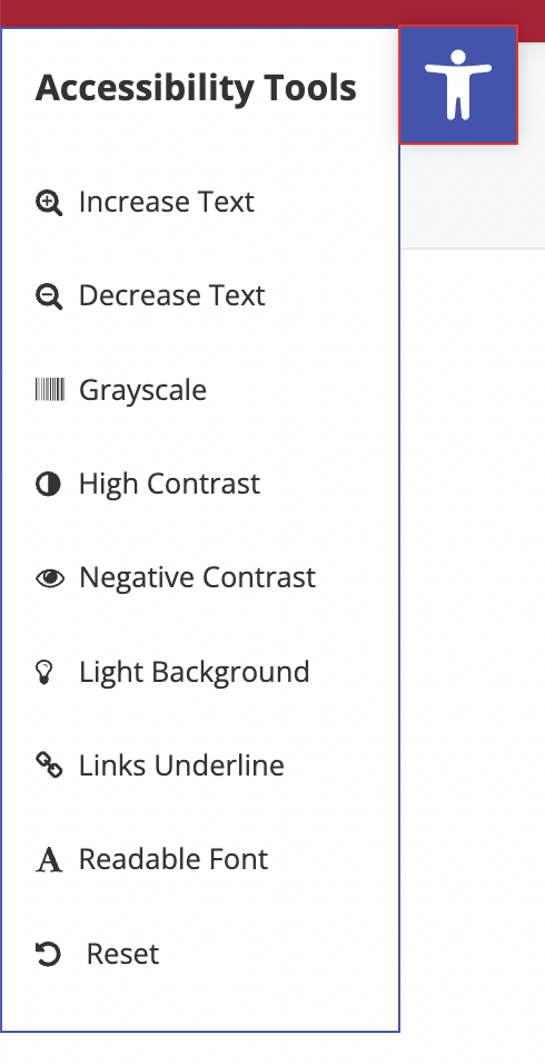 On each page, in the upper left-hand corner, you should see a small blue tab with a person icon floating over the edge of the page (see images below). If you click or select this blue tab, a menu will expand with a list accessibility options you can choose to help you more comfortably access information.